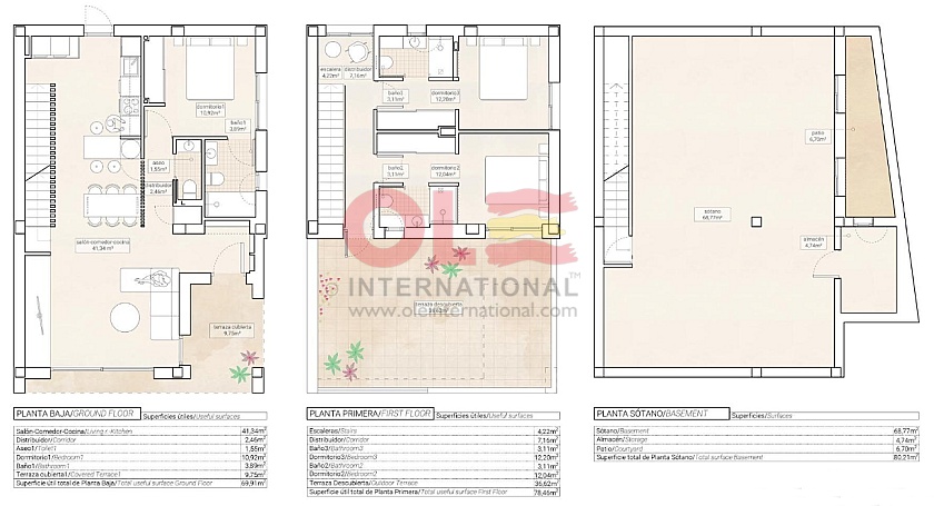 They are homes built on two floors with a basement, with 3 bedrooms, 3 bathrooms and a toilet, an American kitchen in the living room, a terrace and a private solarium.